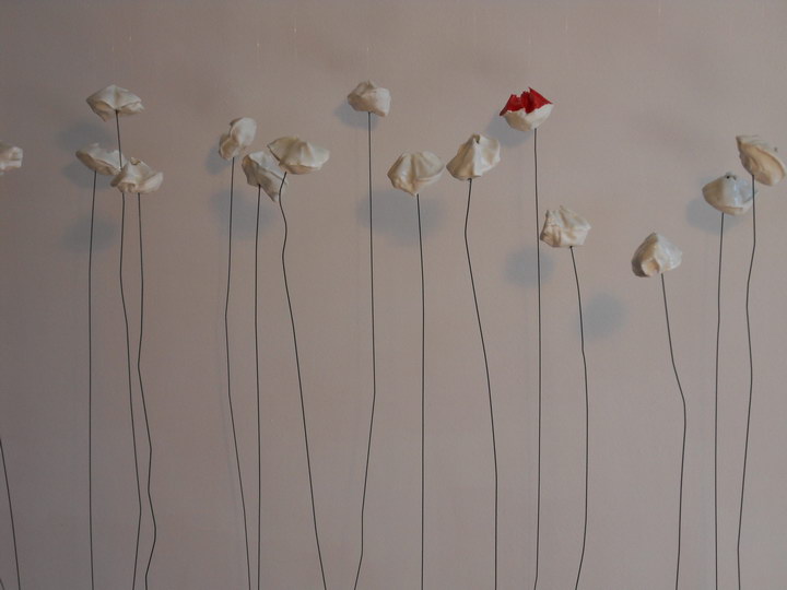 Marie Chantelot y présente son travail d'appréhension du temps qui passe, au travers d'installations tout en fragilité. Elle récupère de petits objets et fragments du quotidien: sachet de thé, capsules de café,... qu'elle trempe dans la porcelaine. Elle donne ainsi une seconde chance pleine de poésie. Les capsules sont installées en un champs de coquelicots, un fil de laine devient le symbole du temps qui passe et s'enroule sur des fuseaux évanescents. Muriel de Crayencour – L'Echo 16 octobre 2010